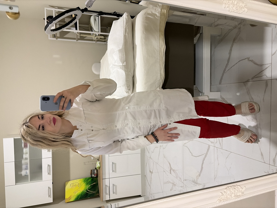 The image displays a mirror selfie of a woman within a professional interior, consistent with an aesthetic clinic, beauty salon, or spa located in Budva, Montenegro. The subject, a woman with blonde, wavy hair and red lipstick, wears a white, knee-length, long-sleeved lab coat or tunic with snap fasteners, red trousers, and light-colored platform slide sandals. She holds a light blue smartphone in her left hand, displaying a dark ring on her ring finger, while a dark beaded bracelet is visible on her right wrist. The environment includes a white-framed mirror reflecting the scene. To the left of the subject, white wall-mounted cabinets with glass doors, a countertop, and white base cabinets are visible. A vertical painting with a green and yellow abstract design is mounted on the wall above the countertop, alongside several small containers. To the right, a professional treatment bed with light-colored linens and a disposable paper covering is present. A white ring light on a stand and a partial view of a white open-shelf unit are also visible. The floor is covered with white tiles featuring grey marble-like veining. The walls are uniformly light-colored.