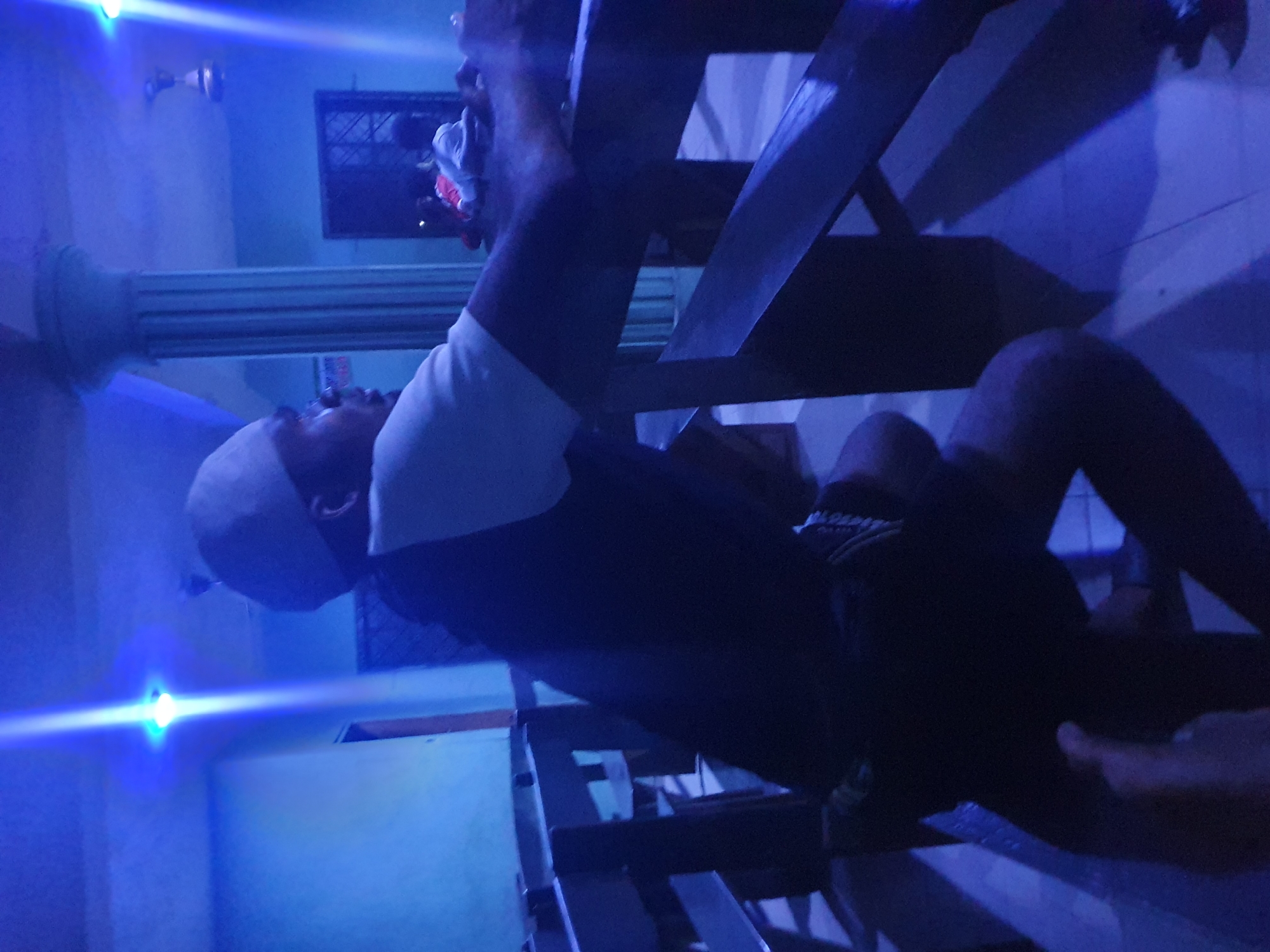 The image portrays an indoor scene, bathed predominantly in an intense blue artificial light originating from a ceiling fixture, giving the entire environment a cool, cyan cast. In the left foreground, a person is depicted from a side angle, appearing to sit or squat in a low position, with their forearms resting on a dark wooden bench or railing. This individual wears a light-colored skullcap, a two-toned shirt consisting of a white short-sleeved upper section over a dark lower section, and dark shorts or trousers. Their face is visible in profile, directed towards the right side of the frame. The immediate surroundings feature dark wooden benches or railings, characteristic of communal seating. Architectural elements include a prominent, light-colored fluted column in the mid-right background, extending from the floor to the ceiling, and walls that appear to be painted a light green or teal, though muted by the blue light. A doorway is visible to the left of the column, and a gridded window is in the far right background. Distant, blurred figures of other individuals are discernible in the background, one with a visible red garment, suggesting other occupants in the area. The floor is tiled. This scene is located within a building in Lokoja, Nigeria.