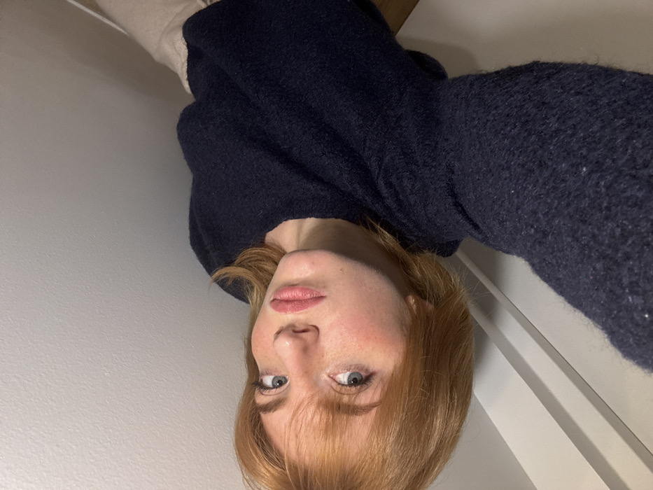 The image depicts a young female subject, captured in a portrait orientation rotated 90 degrees counter-clockwise. She is positioned centrally, with her head and upper torso prominent. The subject has light reddish-brown hair styled with bangs, light blue eyes, and visible freckles across her nose and cheeks. Her lips are adorned with a pink or coral-colored cosmetic. She is wearing a dark navy blue, possibly knitted, long-sleeved top. Her expression is neutral, and her gaze is directed straight towards the camera lens, indicating a self-portrait. The background is simple and suggests an indoor setting. To the subject's immediate right (corresponding to the lower left portion of the frame when viewed upright) is a white surface featuring a horizontal white molding or trim. To her left (upper right portion of the frame when viewed upright) is a light beige or off-white soft-textured surface. The lighting is soft and uniformly diffused. The specific location within the city of Lille, France, cannot be determined from the visual information provided in this image.