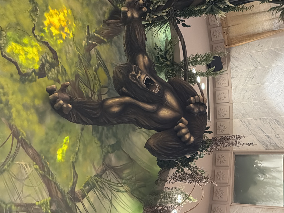 A large, dark brown, stylized gorilla sculpture is suspended from a ceiling painted with a vibrant jungle canopy motif