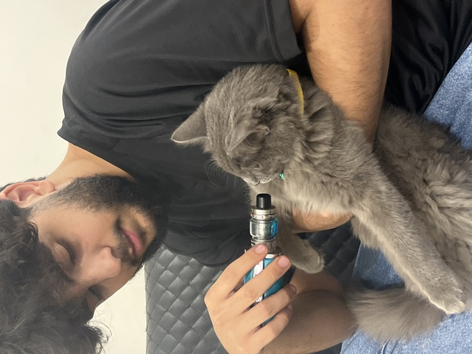 - "An indoor scene in Al-Qanawat Municipality, Syria, depicts a young adult male holding a grey cat while presenting an electronic vaping device near its face" by FM-WnN6r1, licensed under CC BY 4.0