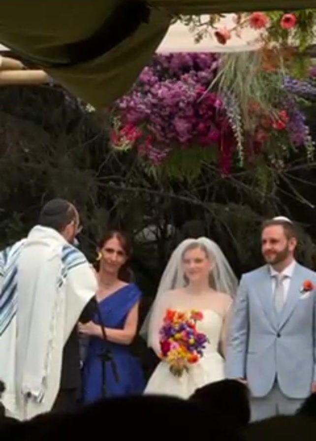 In a medium shot, a Jewish wedding ceremony is underway outdoors under a chuppah adorned with vibrant floral arrangements