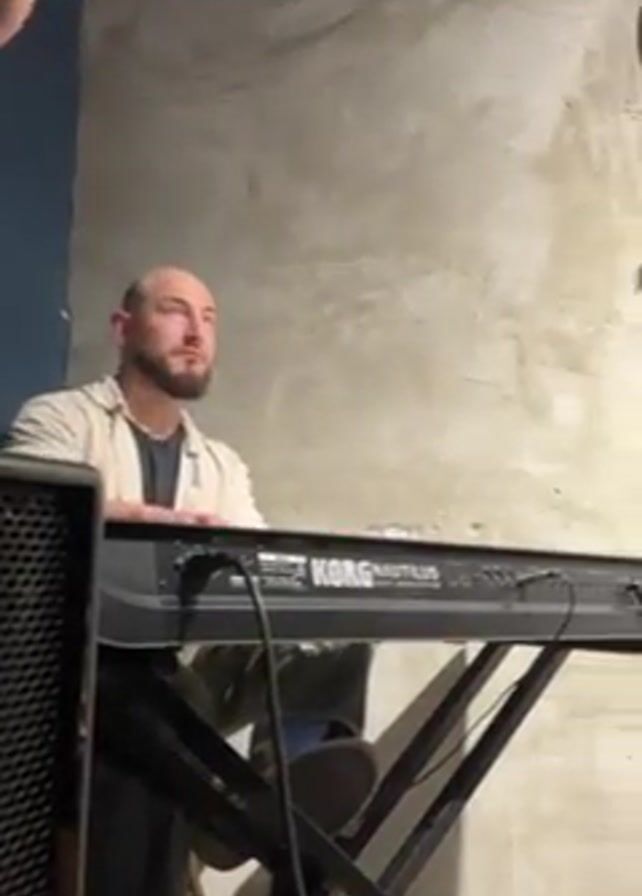 bald man with a beard playing a Korg Nautilus keyboard in a band practice space