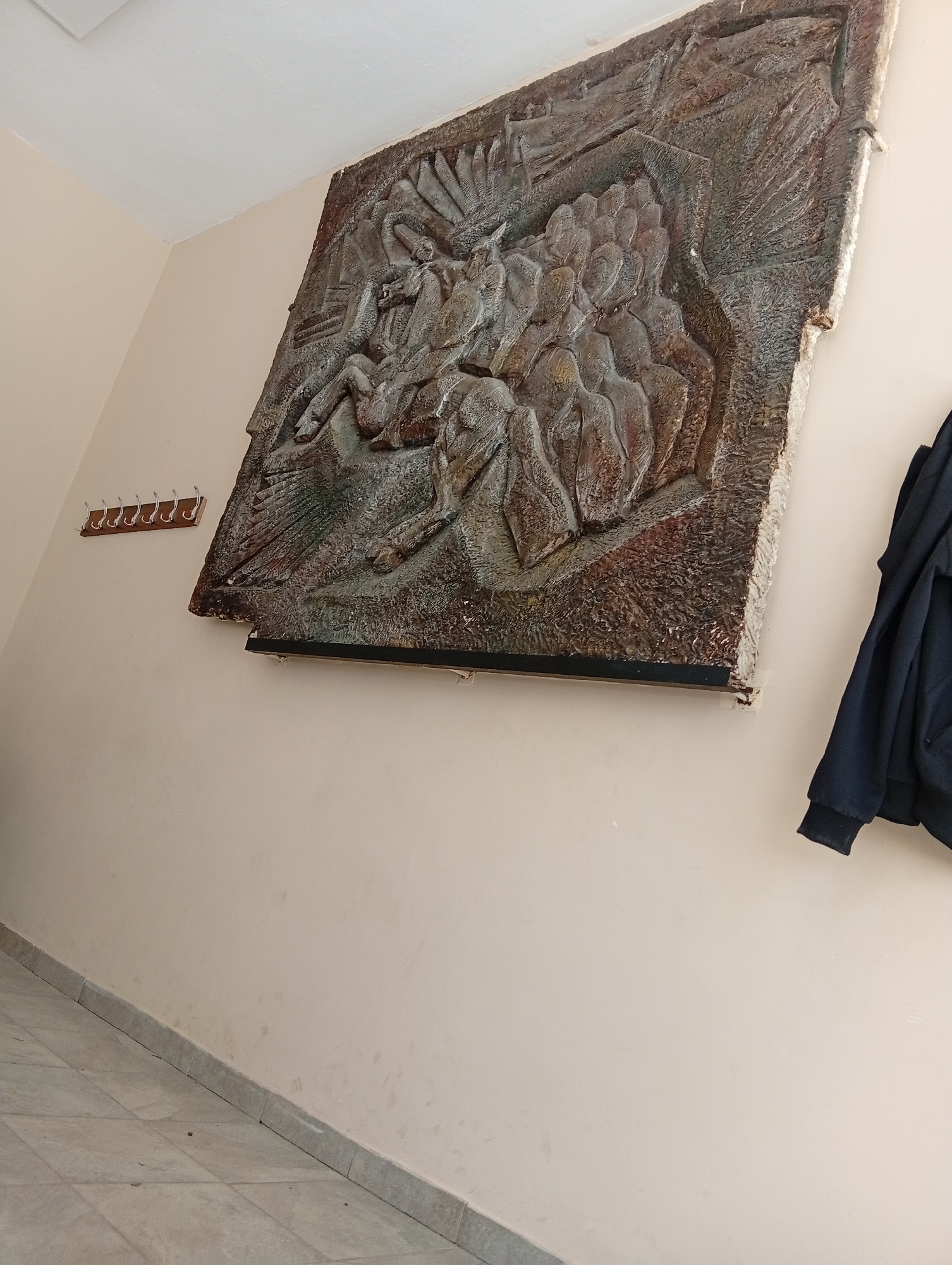 A medium shot captures a large, framed, bas-relief art piece hanging on a beige wall in an interior space. The art features a densely packed group of figures and horses in motion, rendered in earth tones, suggesting a historical or mythological scene. To the left of the artwork, a wooden coat rack with metal hooks is mounted on the wall. To the right, part of a dark blue jacket hangs. The floor is tiled with light gray, square tiles. The location is the city of Loznitsa, Bulgaria.