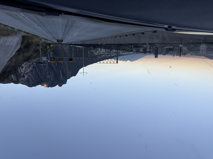 From a car window, a highway stretches forward. A mountain rises on the left, catching the sunlight. Signage frames the highway. Beyond, a city skyline emerges against a light sky. The overall composition is slightly tilted.