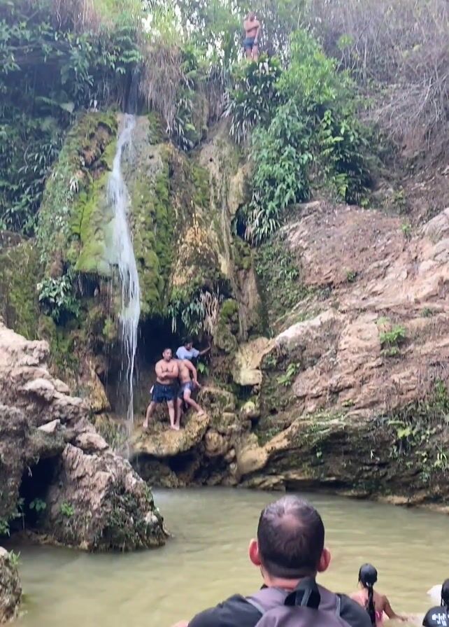 small waterfall in a lush, rocky environment. The water cascades into a shallow pool where several people are swimming and standing. Three men are on the rocks at the base of the waterfall, while another man stands at the top, preparing to jump into the water. He is shirtless and wearing swim trunks. The vegetation is dense and green, with moss covering the rocks around the waterfall. In the foreground, a man with a backpack sits by the water, observing the scene. There are additional individuals swimming in the pool as well.