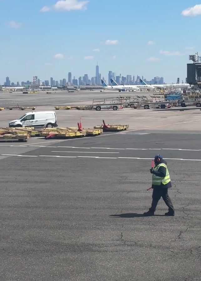 n airport tarmac under a sunny sky with a partial view of a cityscape in the background. The cityscape includes tall buildings, and what appears to be the New York City skyline. In the foreground, a person wearing a neon yellow safety vest, dark pants, and what appears to be a head covering walks across the asphalt tarmac. The person is holding a red object in their hand. Behind the person are several pieces of ground equipment, including a white van, various trailers, and some metal barriers. Further in the background are several planes, including ones with the "United" logo on them.