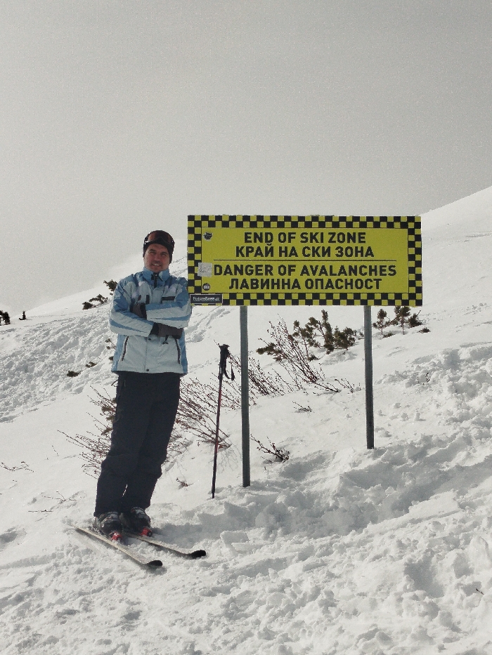 A male individual in ski attire stands on a snow-covered mountain slope, posing with arms crossed. He wears a light blue and white ski jacket, dark ski pants, dark gloves, a dark beanie with goggles pushed up, and skis with boots are attached to his feet. A single ski pole leans in the snow beside him. To his right, a large yellow rectangular sign with a black and yellow checkered border is erected on two metal poles. The sign displays text in both English and Bulgarian: "END OF SKI ZONE / КРАЙ НА СКИ ЗОНА" and "DANGER OF AVALANCHES / ЛАВИННА ОПАСНОСТ." A small "FuturoSec" logo is visible on the sign. The surrounding environment is a steep, white, snow-covered incline with sparse, leafless, brown shrubs protruding from the snow. The sky is overcast and appears white. The scene is located within a mountainous ski area near the city of Samokov, Bulgaria, specifically within the municipality that encompasses the Borovets ski resort.