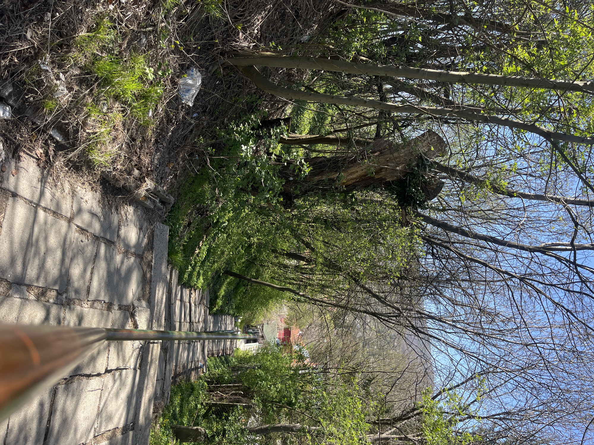 The image depicts a path in Vladaya, Bulgaria. The path is constructed of concrete blocks. A metal railing runs along the left side of the path. Trees line the path, some with bare branches and others with new green leaves. There is some trash visible on the left side of the path. In the distance, a red roof is visible. The sky is blue and clear.