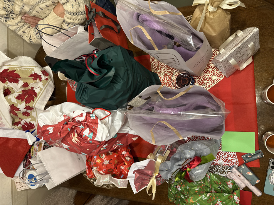 This image displays a wooden tabletop, located in Kawasaki, Japan, densely covered with numerous wrapped gifts, shopping bags, and assorted items