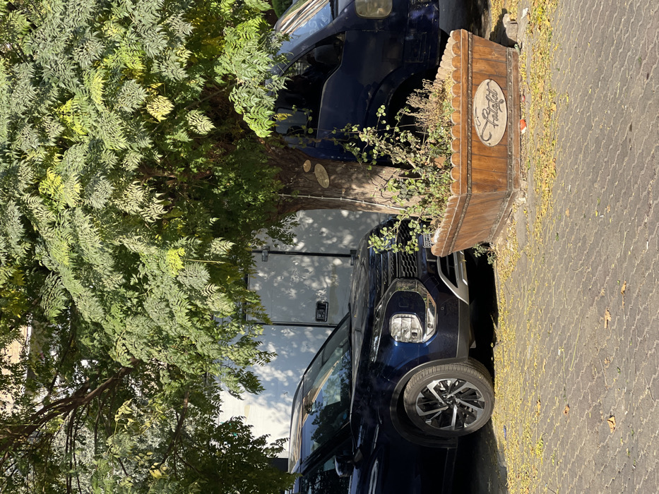 An outdoor scene in Sarouja Municipality, Syria, depicts two vehicles parked on a patterned brick pavement. A dark blue SUV is positioned on the left, facing right, with its front bumper, grill, headlights, and front-left wheel clearly visible. A portion of its license plate is visible. To the right, partially obscured by a tree, a dark blue van or small truck is parked. A large deciduous tree with dense green and light green foliage stands prominently in the center, its trunk displaying several small, light-colored, possibly wooden, oval plaques. At the base of the tree, a square wooden planter box, constructed from horizontal planks with a scalloped top edge, contains green and somewhat dried vegetation. An oval plaque with ornate script, possibly "Falahat," is affixed to the front of the planter. Yellow-green leaves are scattered across the brick pavement. Sunlight creates distinct shadows, indicating a daytime setting. No individuals are present.