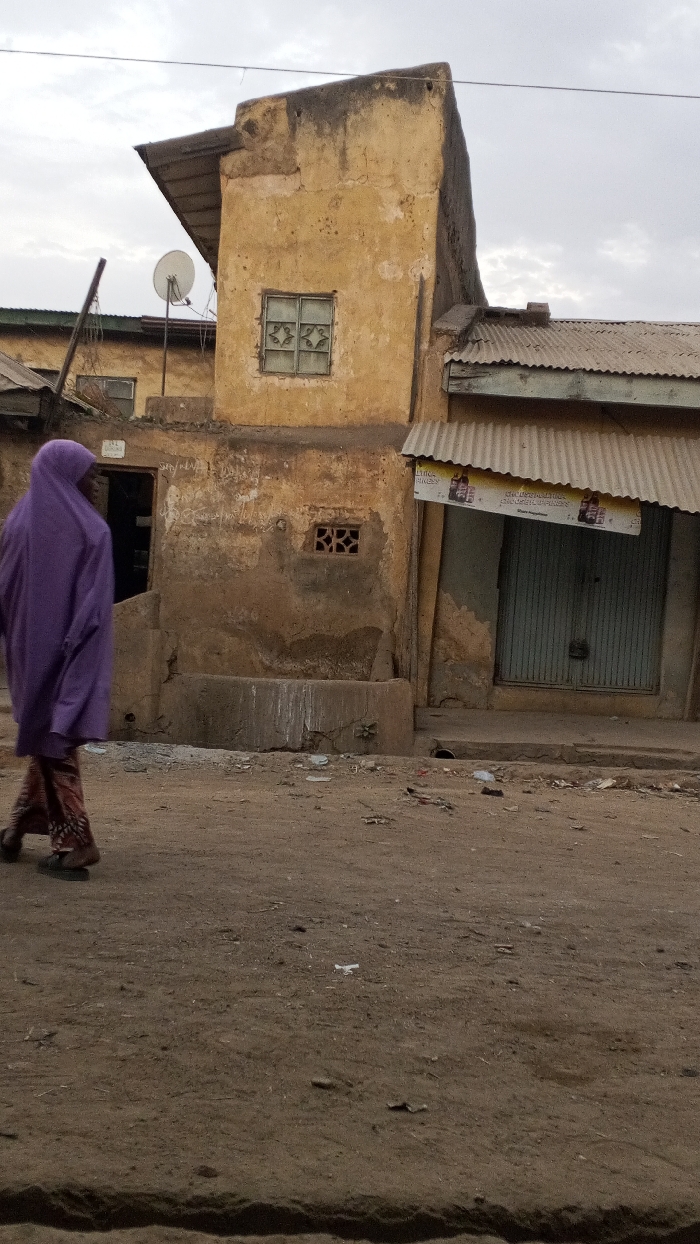 A woman in a purple headscarf walks along a dirt road in front of aging buildings. The structures are faded yellow with peeling paint, and some have corrugated metal roofs. One building features a satellite dish. A sign hangs above a closed door on one building, partially obscured. The ground is uneven and dusty, suggesting a dry climate. The sky is overcast.