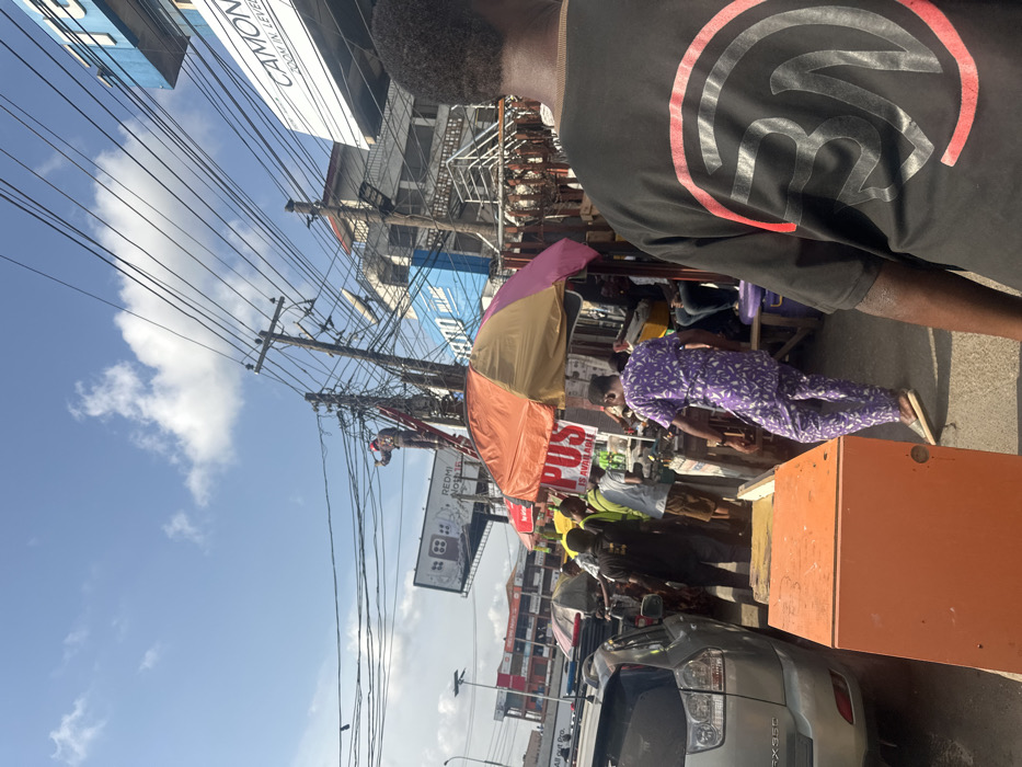 The image presents a busy daytime street scene in Ikeja, Nigeria, under a bright blue sky with scattered white clouds. The upper portion of the frame is dominated by a dense network of black electrical and communication cables strung between multiple wooden utility poles. In the mid-ground, a person wearing a red cap, a light-colored long-sleeved shirt, and dark pants is standing on an orange A-frame ladder, actively engaged with the overhead wiring near one of the utility poles. A large billboard displaying "REDMI NOTE 12" is visible behind and to the left of the ladder. Further right, a building facade features a sign reading "CAMON ZOOM IN LEVELS". At street level, the scene transitions into a bustling commercial area. An orange and pink striped market umbrella shelters a vendor stall in the mid-ground, beneath which a sign states "P.U.S IS AVAILABLE". Several individuals are present: * In the immediate foreground on the right, the back of a person wearing a black t-shirt with a large black and red circular "BN" logo is visible. * To the left of the umbrella, a person in a purple patterned two-piece outfit and light-colored sandals is walking right-to-left. * Other pedestrians and vendors in various casual attire are congregated around the market stalls and along the sidewalk, some partially obscured. An orange rectangular box or utility cover rests on the ground in the left foreground. A silver Lexus RX 350 SUV is parked or idling on the street to the far left. Multi-story buildings with varied facades line the background, indicating a dense urban commercial environment.