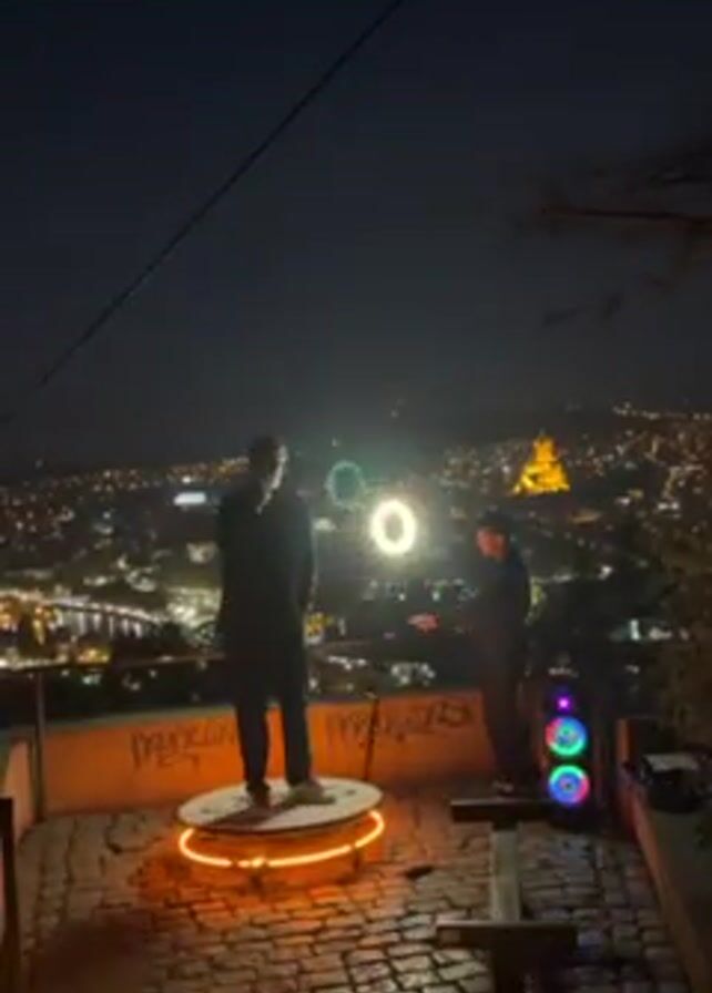 Two men are on a platform overlooking a city at night. The first man stands on a circular platform with orange lights around the edge. He is facing away from the camera. He flips a cigarette and exhales the smoke. The second man is standing to the right of the platform. He is wearing a black hoodie and is facing the camera. He points to the distance. There is a portable speaker next to him. The city is lit up in the background. The sky is dark.