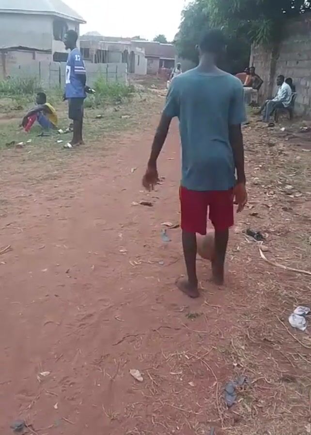 young person kicking a soccer ball on a dirt field. The person is wearing a blue-green t-shirt and red shorts, and is barefoot. In the background, there are other people, some standing and some sitting, along with some buildings and trees. The ground is a reddish-brown color and littered with trash. The sky is overcast.