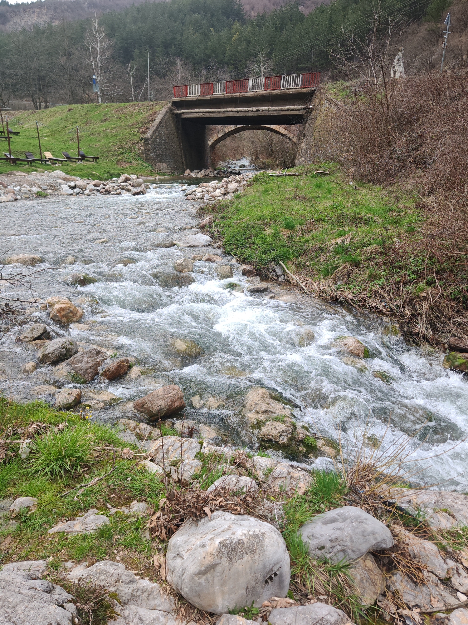 The image depicts a fast-flowing river under a bridge. The river is shallow, with numerous rocks visible and causing the water to churn and foam. The banks are lined with grass and some sparse vegetation. The bridge appears to be made of concrete and stone, with a red and white railing. The location is the city of Vratsa, Bulgaria. The scene appears natural and unpopulated, with only the constructed bridge indicating human presence.