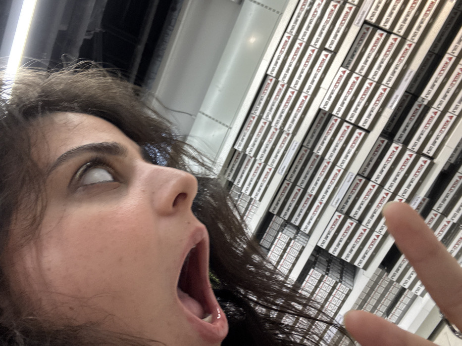 The image presents a close-up, angled, selfie-style view of an individual, likely female, with dark hair, centered on their right facial profile. The person's mouth is open wide, revealing the tongue and lower teeth. The right eye is rolled upward, showing mostly the white sclera with a visible dark eyeliner application. In the lower left foreground, a hand with two fingers extended in a "V" shape is visible. The background consists of multiple white shelving units, densely stocked with numerous identical rectangular boxes. Each box displays Hebrew text alongside a prominent red triangular warning symbol, identifying them as cigarette packages with health warnings. Overhead fluorescent lighting is visible. The scene is consistent with an indoor retail or commercial setting, specifically located in Yagel, Israel.