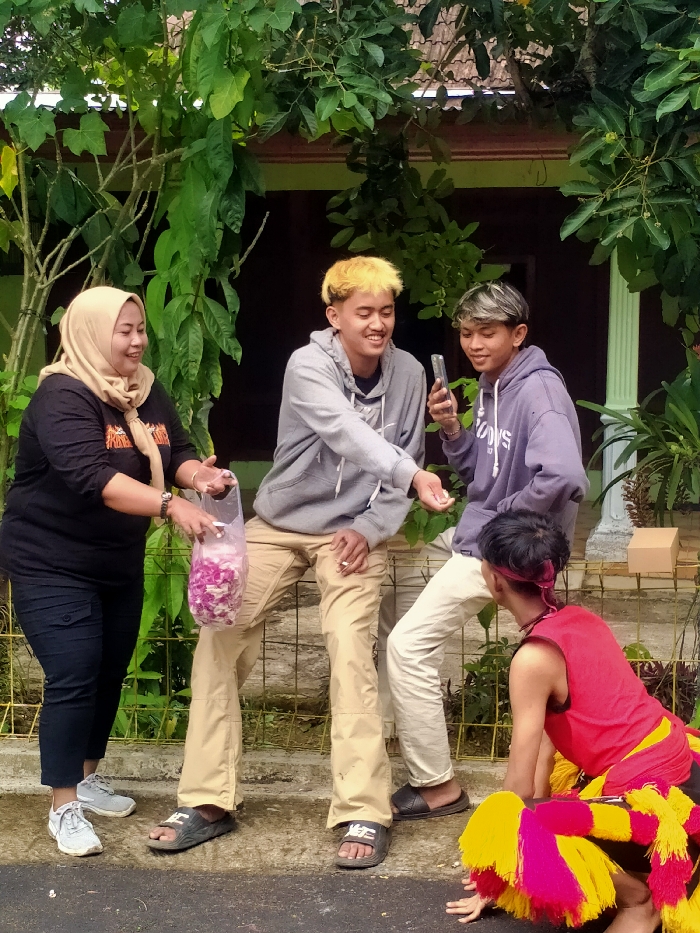 In Pojok, Indonesia, an outdoor scene depicts four individuals engaged in various interactions against a backdrop of residential greenery and a house facade. On the left, an adult woman wearing a beige hijab, black long-sleeved shirt, and dark pants holds a transparent plastic bag containing pink and white petals, extending her right hand towards a young adult male. This male, positioned centrally and leaning on a low wall, has bright yellow hair, wears a grey hooded sweatshirt and khaki pants, and holds a cigarette in his left hand while extending his right hand towards the woman. To his right, another young adult male with grey-streaked hair, wearing a purple hooded sweatshirt and light-colored pants, holds and observes a smartphone, which he appears to be showing to the yellow-haired male. Both young men are smiling. In the lower right foreground, a younger individual in a red vest and a multi-colored (pink, yellow, black) fringed traditional costume is in a kneeling posture, facing away from the camera and looking towards the two young men. The ground is concrete, and a metal fence runs behind the seated individuals. Lush green foliage and parts of a house with dark walls and a white pillar are visible in the background.