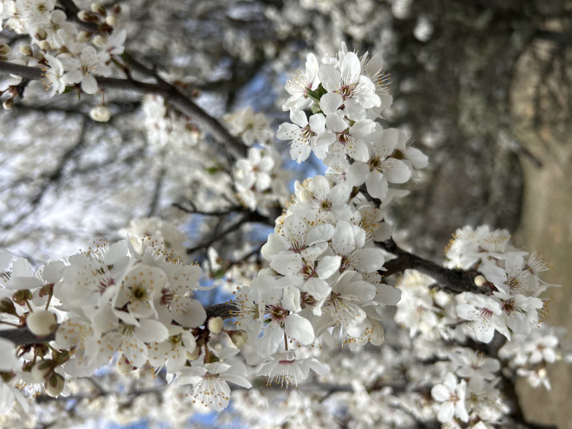 The image displays a close-up, shallow-depth-of-field photograph of a tree branch heavily laden with white blossoms, located in Mala Fucha, Bulgaria. The central subject is a dark brown, gnarled branch covered in numerous clusters of small, five-petaled white flowers. Each bloom features prominent yellow-tipped stamens surrounding a central pistil, which in some flowers shows hints of red or purple at its base. Several unopen white buds are also visible on the branch. The background is significantly blurred, showcasing a diffuse mass of additional white blossoms and branches from the same or adjacent trees, with intermittent patches of clear blue sky visible through the foliage. The lower portion of the blurred background suggests indistinct brown and grey tones, possibly representing ground or distant vegetation. No people, animals, man-made objects, or specific actions/interactions are depicted. The scene is illuminated by natural daylight.