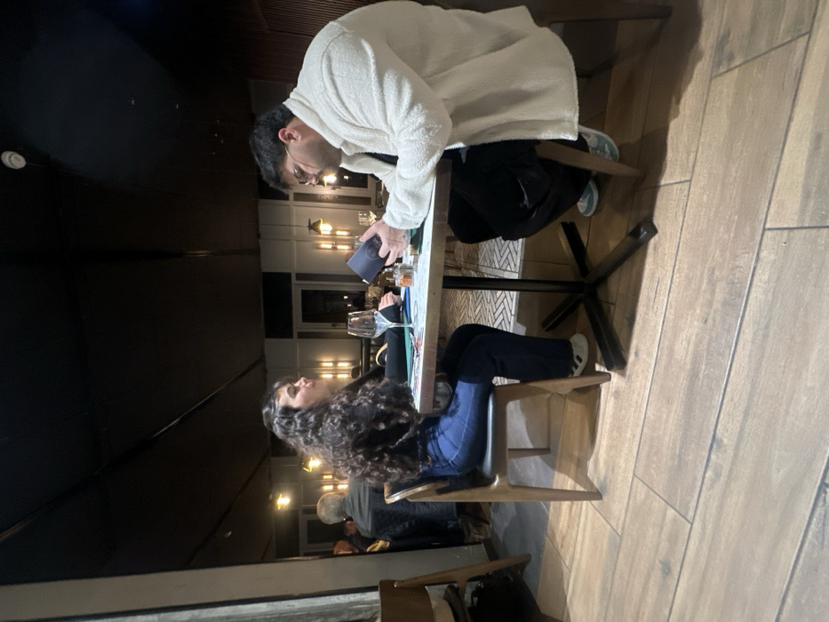 Two people sit at a table. A man in a white jacket looks down at a small, dark object he holds in his hands. A woman with long, curly hair sits across from him, looking at him. A clear glass and a small bottle are on the table. A dark interior with several lights is visible in the background. The floor is made of light brown planks. A couple of other people sit behind the woman at a separate table.