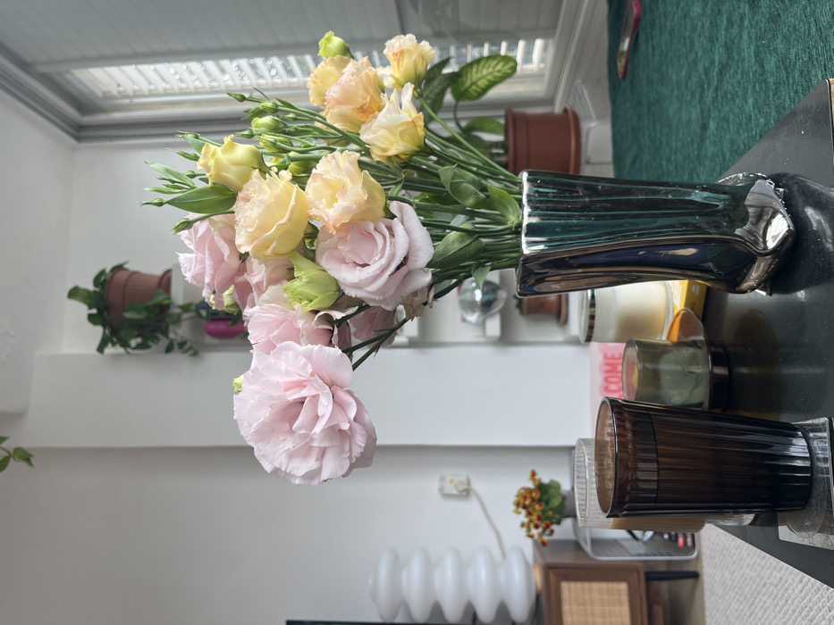 An interior view of a residential living space, likely a living room, located in Tel Aviv-Yafo, Israel. The central focus is a bouquet of Eustoma (Lisianthus) flowers arranged in a reflective, silver-toned, geometrically-shaped vase on a dark, glossy table surface. The flowers present a spectrum of light pink, pale yellow, and cream hues, accompanied by green stems and foliage. On the dark table, to the left of the vase, a dark brown, vertically fluted glass rests on a coaster, with a partially visible clear, ribbed glass behind it. Further left on the table, a white candle in a silver-rimmed holder, a green candle within a brown dish, and a pink decorative object spelling "COME" are present. In the mid-ground on the left, a stacked, ribbed, white table lamp illuminates a light wooden cabinet featuring a woven panel front. A small potted plant with orange-red berries or flowers is positioned on this cabinet, adjacent to a white electrical outlet visible on the wall. The background consists of white walls. A window with vertical blinds or louvers on the right allows natural light into the room. A large, green-leafed plant in a brown pot is situated on a clear stand near this window. Additional potted plants are visible on shelves in the deeper background, and a trailing plant hangs from an upper section of the left wall. The floor area displays a dark green textured fabric on the right and a lighter textured rug on the left. No individuals are present in the scene.