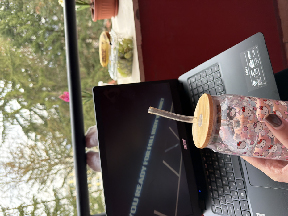The scene depicts a personal outdoor setting, likely a balcony or terrace, in the city of Unknown, Unknown. In the immediate foreground, a person's right hand, with dark brown painted fingernails, holds a clear glass beverage container featuring a pink and white "Hello Kitty" pattern, a wooden lid, and a clear glass straw. The container holds a light pink liquid. Behind the hand, a black Acer Aspire 3 laptop is open, resting on a dark surface, possibly the person's lap. The laptop screen displays white text against a dark background, partially legible as "YOU READY FOR FULL BODY WORKOUT". Midground elements include a black metal railing stretching horizontally across the frame. Beyond the railing, on a red-painted ledge, a clear plastic container filled with green grapes is visible. A single yellow banana rests atop the grape container. Further to the right on the ledge, a small potted plant in a brown pot is present. The background consists of blurred green foliage, indicative of trees, under an overcast sky. A blurry pink flower is visible among the foliage to the left of the railing.