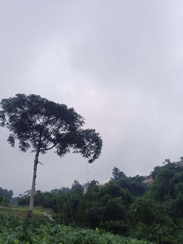 The image displays an outdoor landscape in Makilala, Philippines, under a uniformly overcast, light grey sky. In the foreground, a field of dense, low-growing green leafy plants covers the bottom portion of the frame. A tall, slender tree with a light-colored, mostly bare trunk and a voluminous crown of dark green foliage dominates the left side of the midground, extending towards the upper left. To the right and behind this tree, the terrain is covered by a dense mass of various green trees and bamboo, forming a natural barrier. In the upper right background, partially obscured by the extensive foliage, a structure with a reddish-brown roof and lighter-colored walls is visible, situated on an elevated section of land. No individuals or specific actions are discernible within the scene.