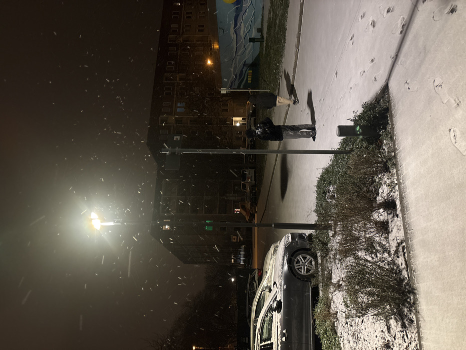Snow falls heavily in a dark urban scene at night. A tall apartment building looms in the background, illuminated by sporadic lights. A street lamp shines brightly, highlighting the falling snow. Two figures stand on a snow-covered sidewalk, casting long shadows. A parked car is visible along the curb, dusted with snow. Footprints mark the snowy ground.