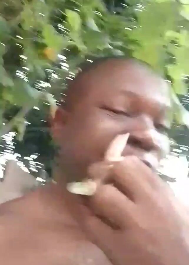 A close-up, slightly underlit shot shows a shirtless, dark-skinned man with a shaved head eating something green from a stem or branch. He is facing the camera. The background is filled with green leaves and branches, suggesting he's outdoors, possibly under a tree. He is chewing with his mouth open and teeth visible.