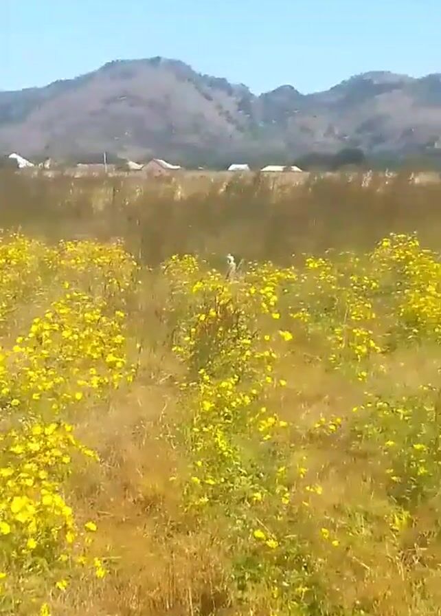 field of yellow flowers, with a mountain range in the background. There is a tree on the right side of the frame. The sky is clear and blue. It appears to be a sunny day. There is music playing in the background.