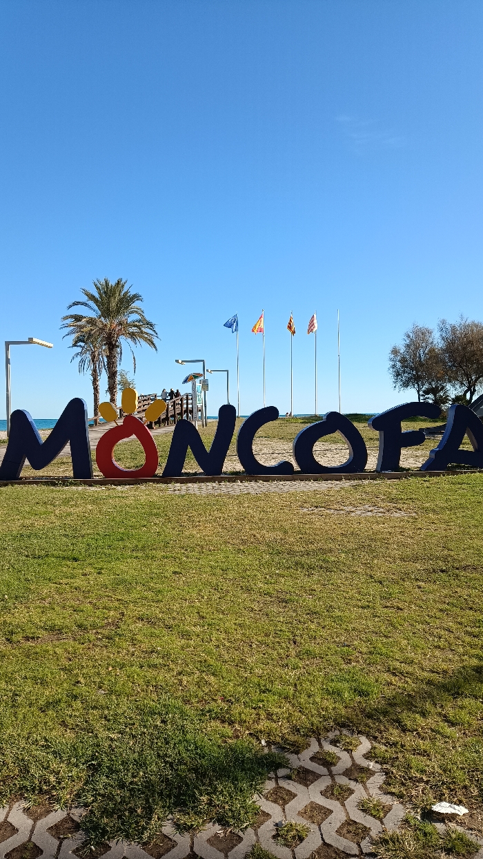 The image depicts a bright, sunny coastal scene in Moncofa, Spain