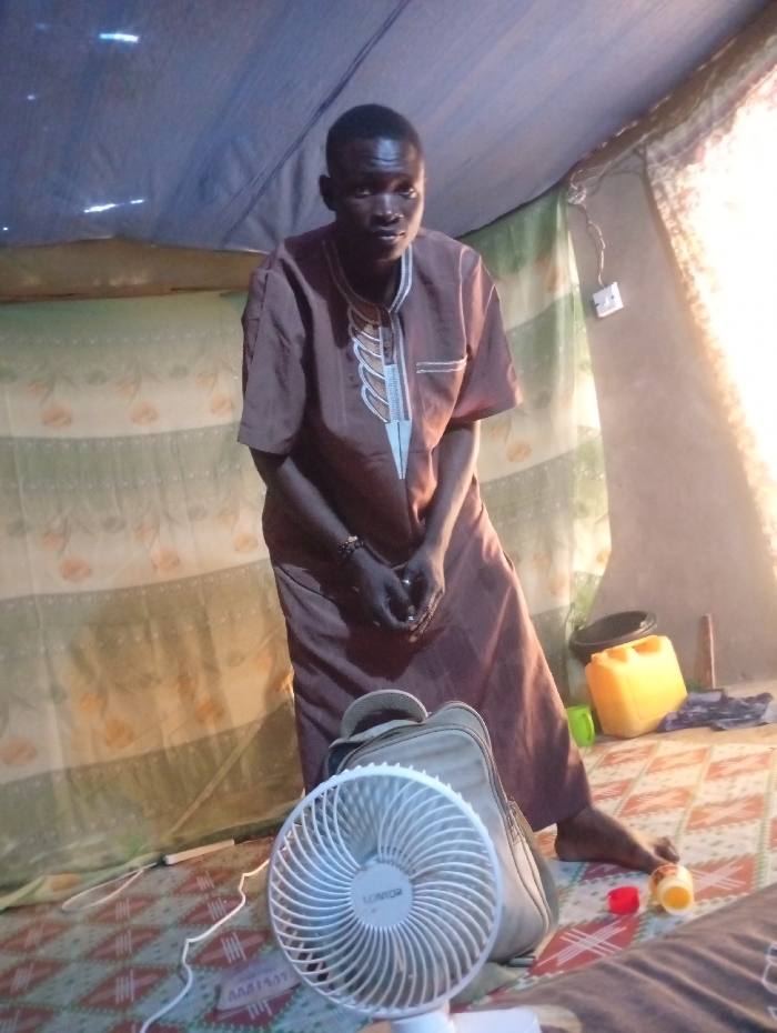 A man stands barefoot in what appears to be a tent-like structure with patterned walls and ceiling. He's wearing a brown tunic with white embroidered details. A small white fan sits on the patterned floor near a backpack. Other items are scattered around: a yellow plastic jug, a black bucket, and small plastic containers. Light streams in from an opening, creating a bright spot in the scene. An electrical outlet is also visible.