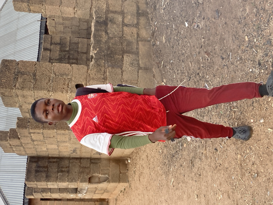 A young man stands outdoors in a red and white soccer jersey, maroon pants, and black shoes. He is positioned on a dirt surface next to a brick building with a corrugated metal roof. He wears a long-sleeved shirt under the jersey. The lighting suggests it is daytime. The camera angle is slightly tilted. A string hangs from his pants.