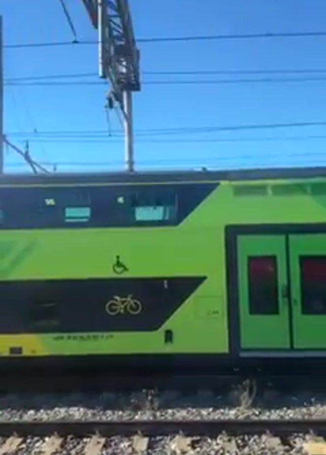 green and black double-decker train car with symbols indicating bicycle and wheelchair accessibility. The train is passing by on a track with overhead power lines against a clear blue sky. The camera appears to be inside another train or moving vehicle parallel to the green train. A voice is briefly heard in the background.