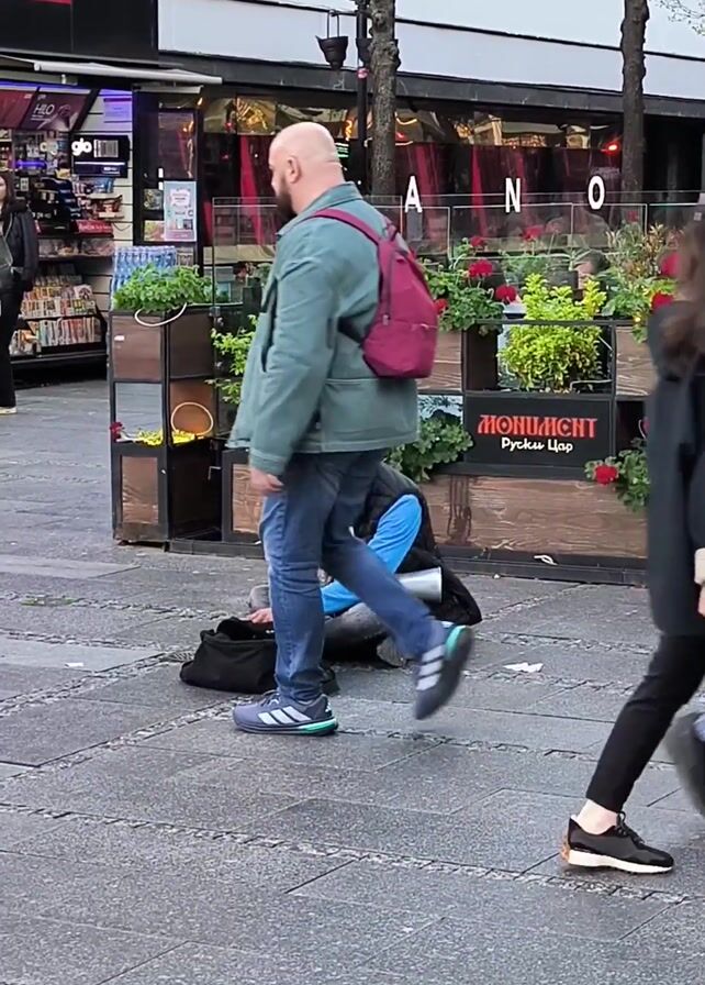 street performer sitting cross-legged on a pedestrian area in an urban setting. He is dressed in jeans and a blue long-sleeved shirt under a black vest. He is sitting on a black bag and there's a green drink next to him. Pedestrians walk by on a tiled surface, including a couple and a man with a red backpack. In the background, there's a kiosk, restaurants with outdoor seating, and decorative planters with red flowers. The street is paved with square tiles.