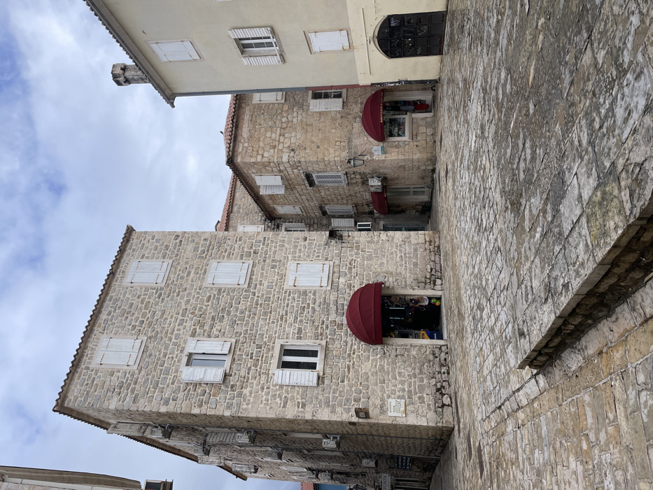 The image depicts a deserted cobblestone square within the Old Town of Budva, Montenegro, under an overcast sky. The square is paved with irregular light grey and tan stone blocks, showing signs of dampness. In the foreground, a raised stone edge separates two sections of the paving. Three primary buildings frame the square. To the left, a prominent three-story structure built from light-colored, rough-hewn stone blocks features a red terracotta tiled roof. Its facades are punctuated by multiple windows with white wooden shutters; some are open, others closed. Several external air conditioning units are mounted on its left-facing wall. The ground floor houses a shop with a dark red semi-circular awning over its entrance, revealing a brightly lit interior with visible merchandise. A white sign with dark text is affixed to the wall beside the entrance. Further into the background, to the right of the central building, another multi-story stone building with a red tiled roof is visible, also featuring white-shuttered windows and a ground-floor shop with a red awning. To the far right, a lighter, pale yellow-beige building with white-shuttered windows and a dark, arched ground-floor entrance stands. A chimney stack is visible on its roofline. No individuals are present in the scene, and no specific actions or interactions are occurring.