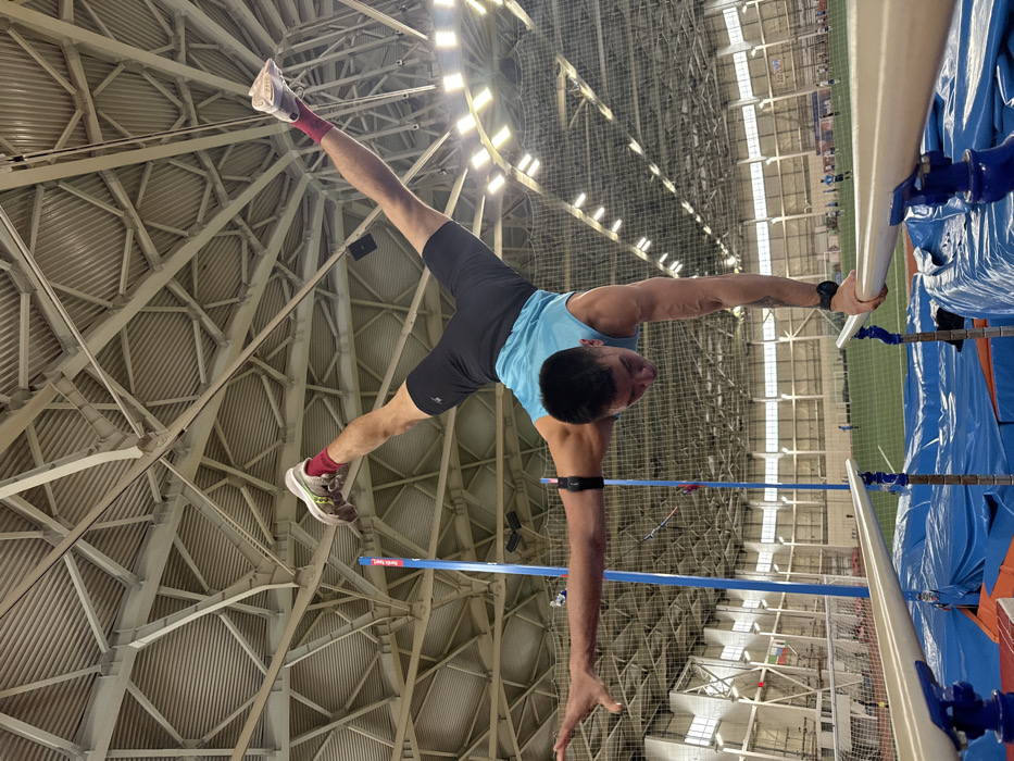 A male individual performs an inverted handstand on parallel bars within an indoor athletic facility in Bol'shoi Sulabash, Russia. The subject is oriented head-down, holding the right bar with his right hand, while his left arm is extended horizontally outwards, fingers splayed. His legs are spread widely in an aerial split, forming a 'V' shape above his torso. He wears a light blue sleeveless top, black athletic shorts, red socks, and athletic shoes featuring white, grey, and neon green accents. A black arm-band is visible on his left bicep, and a black wrist device is on his left wrist. The parallel bars consist of white rails supported by blue structures, resting on blue protective mats. In the background, vertical blue poles, indicative of a high jump or pole vault setup, are visible. The facility's ceiling features an extensive network of light-colored structural trusses and a corrugated roof, with multiple artificial light sources. A green indoor turf field is discernible in the mid-ground, with faint figures of other individuals present. The overall environment suggests a large, well-equipped indoor sports arena.