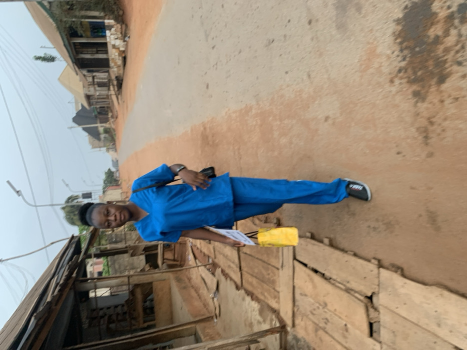 A young woman in blue scrubs stands on a street, holding papers and a yellow object