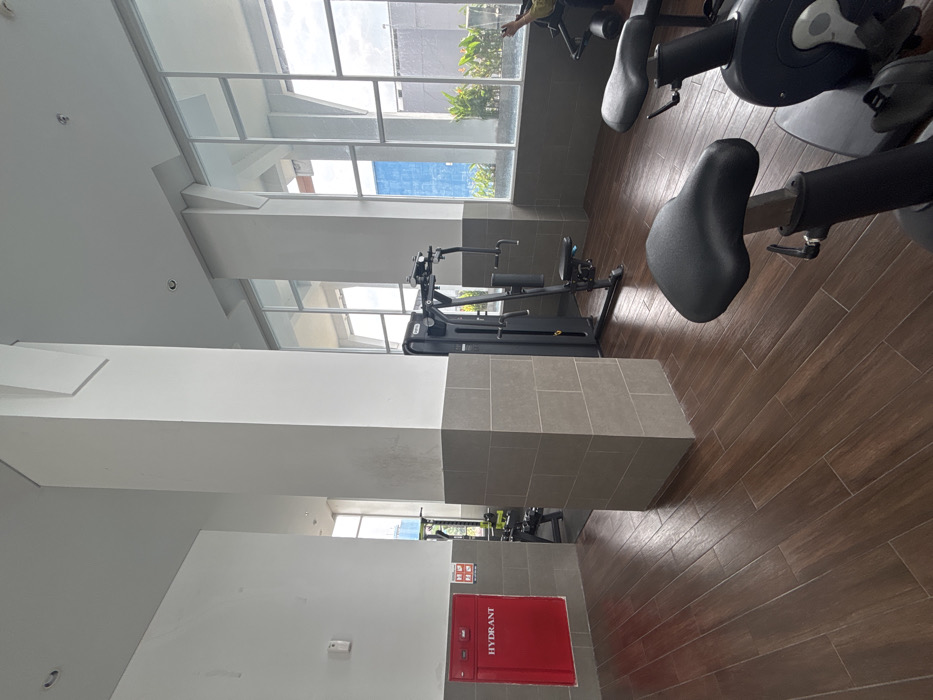 A brightly lit gym features large windows. Several pieces of exercise equipment, including stationary bikes and weight machines, are placed on a wooden floor. A large square column divides the space. A red fire hydrant cabinet is visible on a wall beneath the column. Tiles cover the lower section of the column.