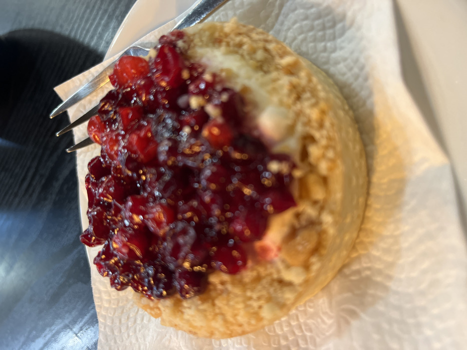 A single round dessert, approximately 8-10 cm in diameter, is centrally positioned on a white, embossed paper napkin. The dessert features a light brown, textured, crumbly crust containing a creamy off-white filling, topped with a dense, glossy layer of dark red berries (possibly cranberries or lingonberries) in a translucent sauce. A silver-colored, four-tined fork is visible on the napkin, positioned to the upper right of the dessert. The napkin and dessert rest on a white plate, partially visible at the bottom and right. The background consists of a dark, blurred surface, consistent with a table. No individuals, actions, or specific interactions are depicted. The scene is located in Krasnoyarsk, Russia.