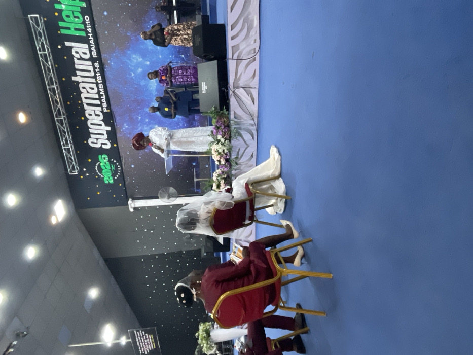 The image portrays an indoor event, likely a church service or ceremony, within a church building in Jos, Nigeria