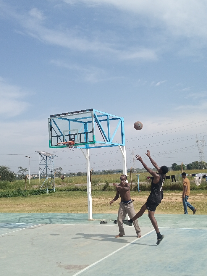 An outdoor basketball court in Hayin Banki, Nigeria, is depicted under a clear blue sky with scattered white clouds