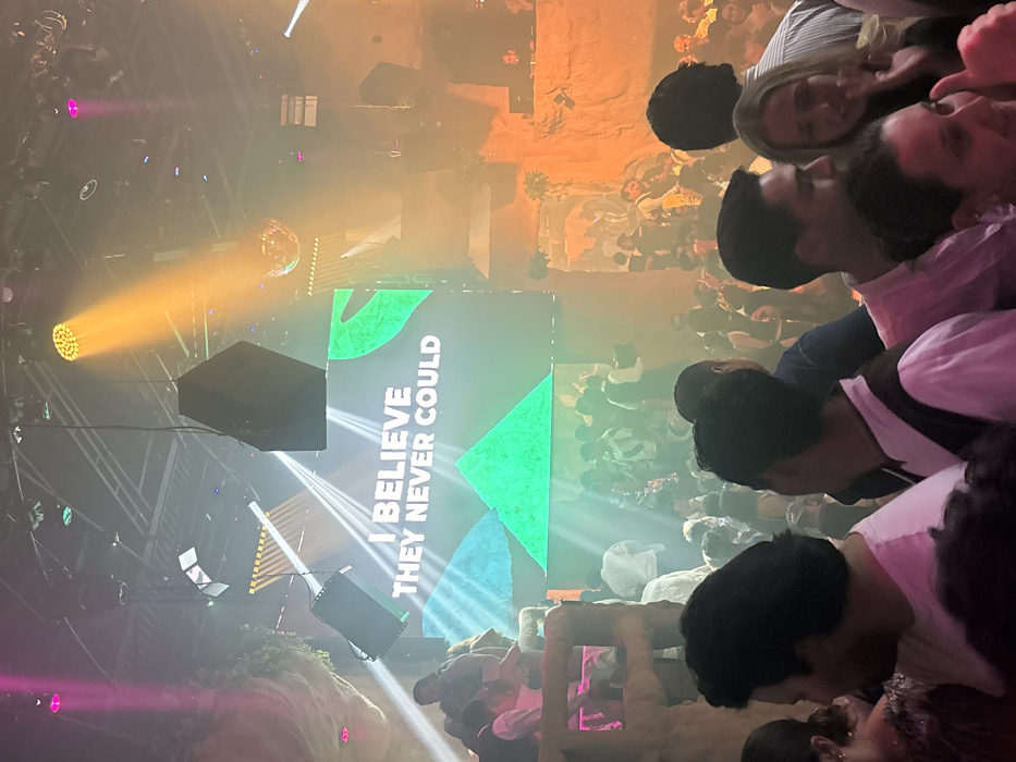 The image depicts a crowded indoor nightclub scene, likely at Coyuca 22 in Acapulco, Mexico, characterized by its distinctive cave-like, multi-level architecture. The environment is illuminated by dynamic club lighting, including orange, pink, and white spotlights creating distinct beams through a smoky or hazy atmosphere. A large, rectangular LED screen dominates the upper center, displaying the text "I BELIEVE THEY NEVER COULD" in white capital letters against a dark background with green and blue geometric shapes. Suspended from the ceiling are multiple black sound speakers and various lighting fixtures, including moving head lights and a disco ball reflecting light. The venue features rough, textured walls resembling rock or stucco in various shades of brown and orange. People are densely packed across multiple tiers of the club, standing and moving. In the foreground, numerous individuals are partially visible, including a man with dark hair in a white shirt and another in a dark vest over a white shirt, facing away. In the mid-ground, a diverse crowd of adults is engaged in social interaction, standing, observing the screen or other patrons. A DJ booth with a person behind it is visible on a higher platform to the right. The overall scene conveys a lively, energetic atmosphere within an entertainment venue.