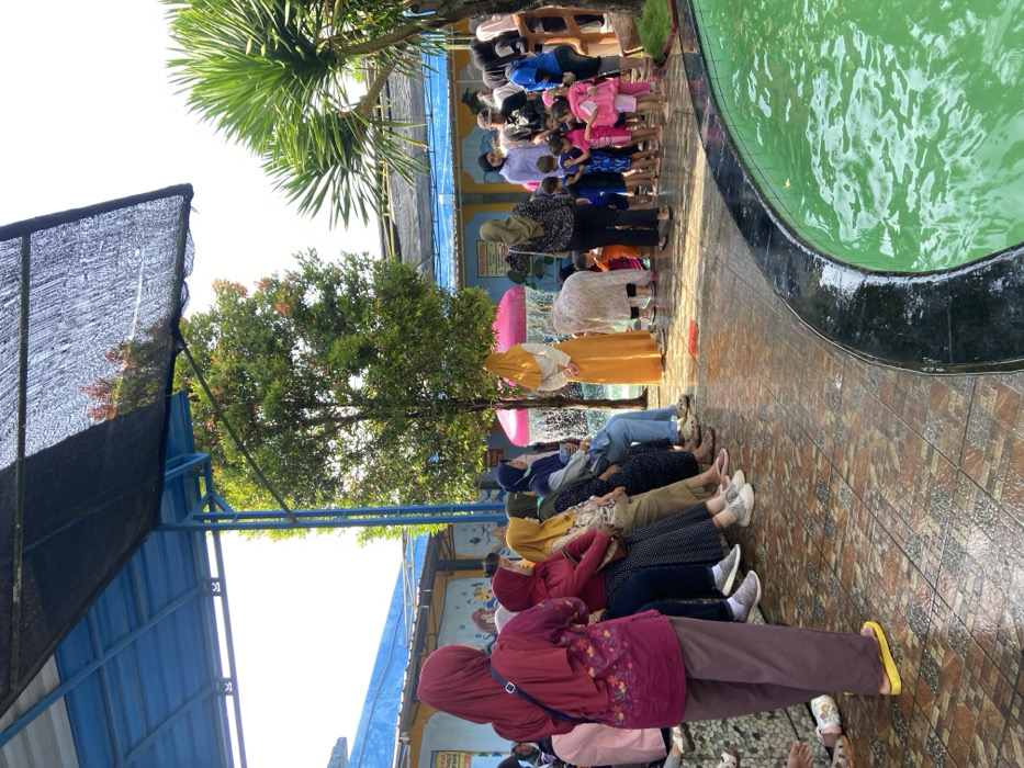 A group of adults and children stand near a pool. The children are lined up closest to the pool, some wearing swimsuits and life vests. Behind them, a line of adults, many wearing hijabs, stretches along the pool's edge. They stand on a patterned tile surface, under the shade of a blue-roofed structure and trees. A palm tree is visible near the pool, and a black mesh cover is present above the crowd. The scene suggests a group outing or event by the pool.