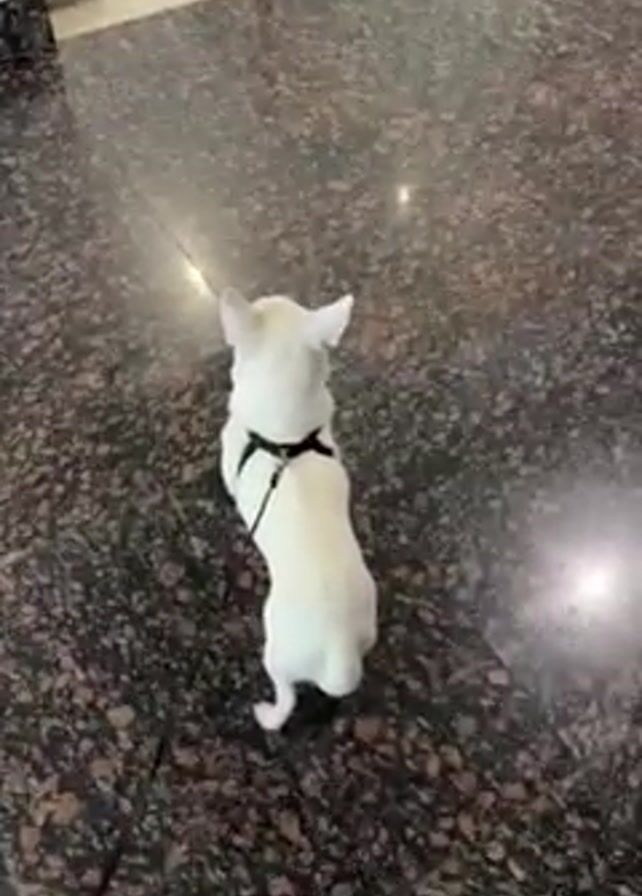 A small white Chihuahua dog with a black harness stands on a brown marbled floor