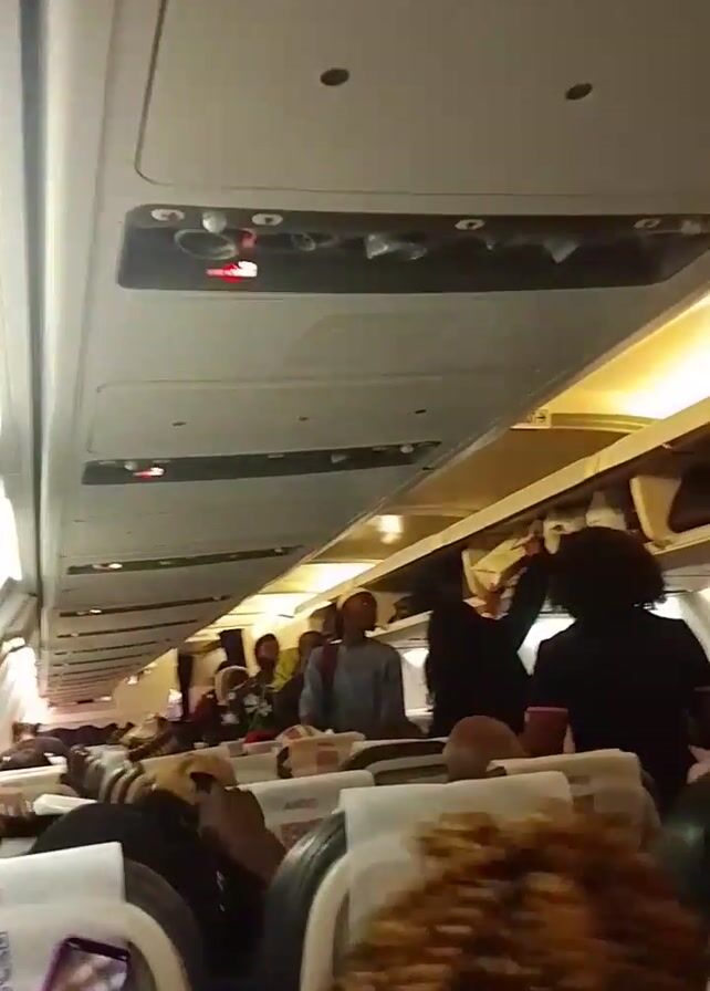 interior of an airplane cabin with passengers and flight attendants. People are seated in rows, and some are standing and placing items in the overhead compartments. The cabin is brightly lit with overhead lights. The seats have headrest covers with a logo and QR code. The ceiling has warning lights.