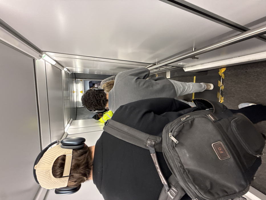 The image depicts several individuals moving through an illuminated, metal-paneled jet bridge, indicative of an airport boarding area, specifically inferred to be Logan International Airport in Boston, United States. In the immediate foreground, a person with brown hair, wearing a reversed beige perforated baseball cap and black Apple AirPods Max headphones, is seen from behind. This person wears a black long-sleeved shirt and carries a black backpack with a brown 'FG' monogrammed patch on its front pocket. Directly in front, a second person with dark curly hair, also wearing black over-ear headphones, proceeds in a gray long-sleeved shirt and light gray pants. Further down the jet bridge, an airport employee in a yellow high-visibility jacket and dark beanie stands on the left, near the aircraft entrance. The jet bridge floor is dark with yellow and black hazard tape and solid yellow lines, and a silver handrail runs along the right wall.