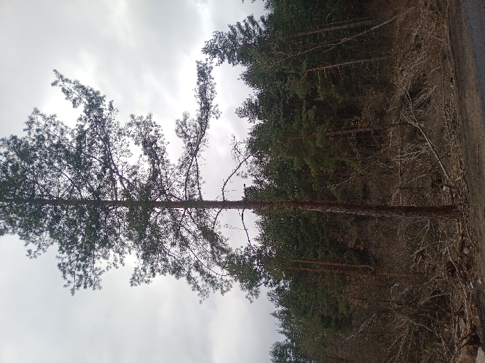 The image depicts a forest edge located in Dolni Pasarel, Bulgaria, under an overcast sky. A single tall, slender conifer tree, primarily a bare trunk with a sparse crown of green foliage in its upper third, stands in the foreground, slightly left of the vertical center. Behind this tree, a dense conifer forest extends across the midground and background. The ground in the immediate foreground and along the forest edge is heavily littered with numerous fallen branches, twigs, and woody debris, interspersed with some bare deciduous vegetation. A dark, unpaved surface, consistent with a dirt road or path, is visible at the very bottom of the frame. No individuals, animals, or man-made structures are present in the scene.