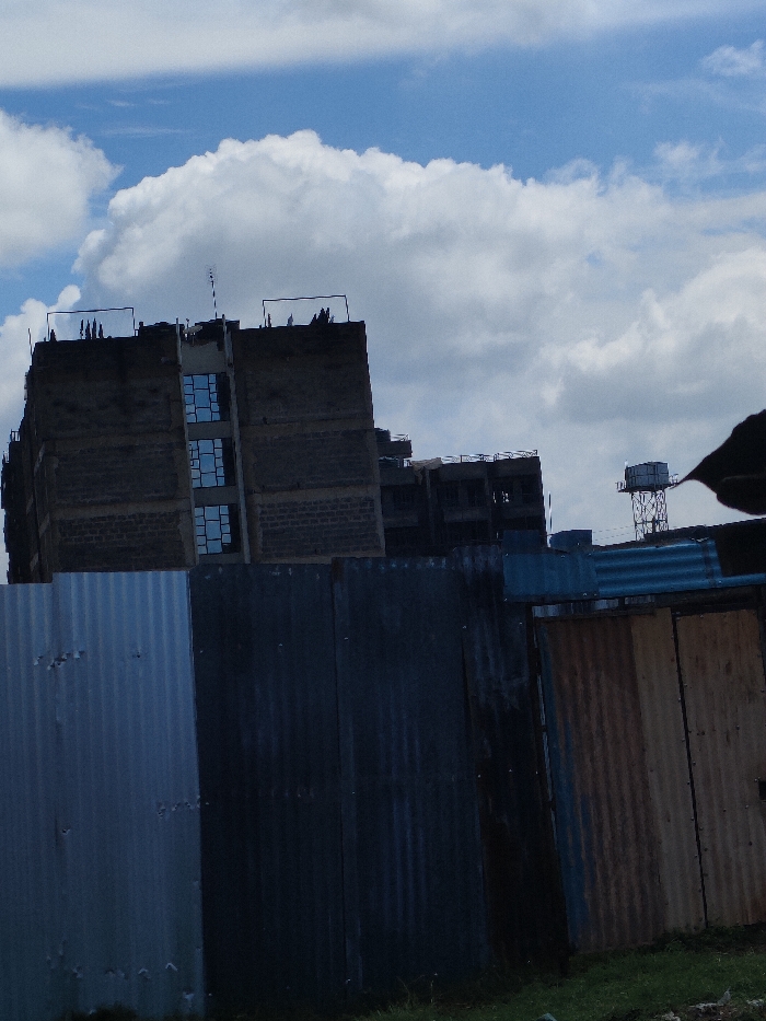 The image depicts an urban landscape under a partially cloudy sky in Juja, Kenya. In the immediate foreground, a temporary construction barrier or property fence is visible, composed of vertically oriented corrugated metal sheets. These sheets exhibit varying colors, including weathered silver-blue, dark grey-blue, and a rusty brown-orange hue, indicating different stages of wear or material types. Green grass is visible at the base of the fence. In the midground, several multi-story buildings are present, appearing to be in various stages of construction or completion. The most prominent building, located to the left, is a concrete-block structure of at least seven visible stories. It features multiple rectangular window openings with blue reflective glass installed on several levels. The uppermost portion of this building shows exposed structural elements or rebar framework. To the right and slightly behind this, another multi-story building is partially visible, also appearing unfinished with exposed framework. Further to the right and in the background, a tall, elevated water tank supported by a metal lattice structure is discernable. The background consists of a sky dominated by large, white cumulus clouds against patches of clear blue sky. No individuals, overt actions, or interactions are observable within the frame.