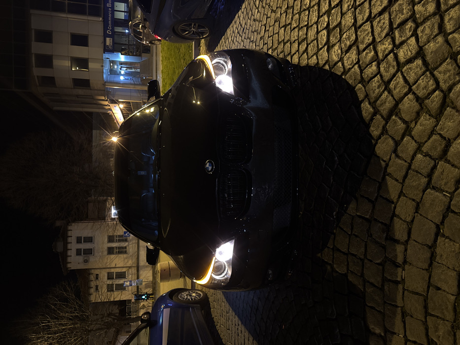 The image depicts a nighttime street scene in Sliven, Bulgaria, on a cobblestone surface. A black BMW E60 5-series sedan is centrally positioned, facing the viewer directly. Its headlights are illuminated, featuring bright white main beams and amber circular daytime running lights/turn signals. The front grille and lower bumper appear blacked out. To the left of the BMW, the front portion of a blue two-door hatchback is partially visible. Behind these vehicles, an older, light-colored multi-story building with multiple windows and a distinctive roofline is present, flanked by bare trees. A light-colored cylindrical bollard and two blue signs on poles (one appearing to be a parking sign, another potentially indicating accessibility) are situated between the blue car and the BMW. To the right of the BMW, the front-right quarter of another dark-colored vehicle is partially visible. Behind these cars stands a modern multi-story building with a glass facade, illuminated from within. A sign on this building clearly displays "D Commerce Bank." A patch of green grass is visible in front of the modern building. Artificial street lighting provides illumination, creating starburst effects around brighter light sources. No individuals are visible in the scene.